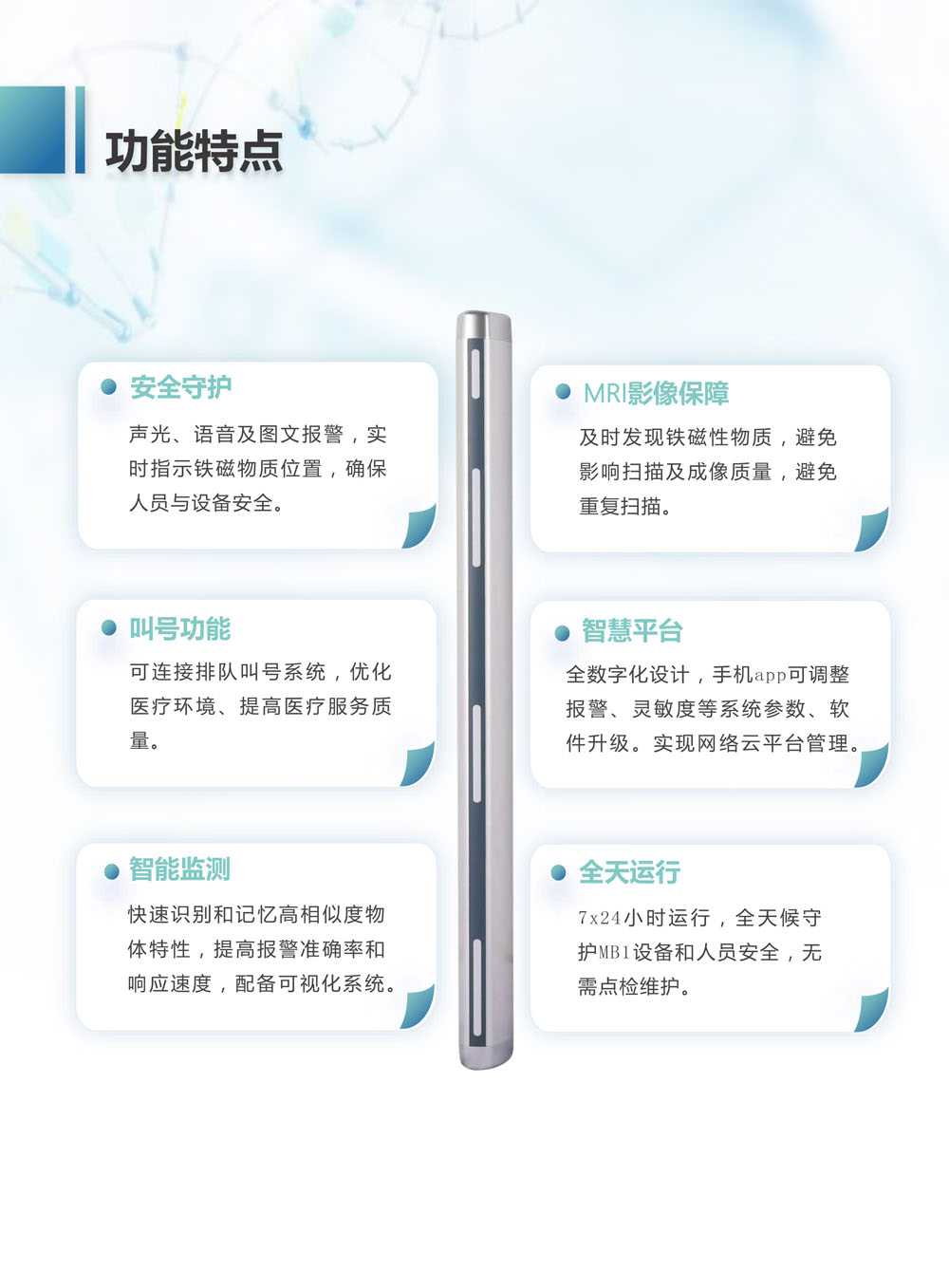 保障设备:辅助性的报警提示,避免铁磁物体损伤核磁共振设备。